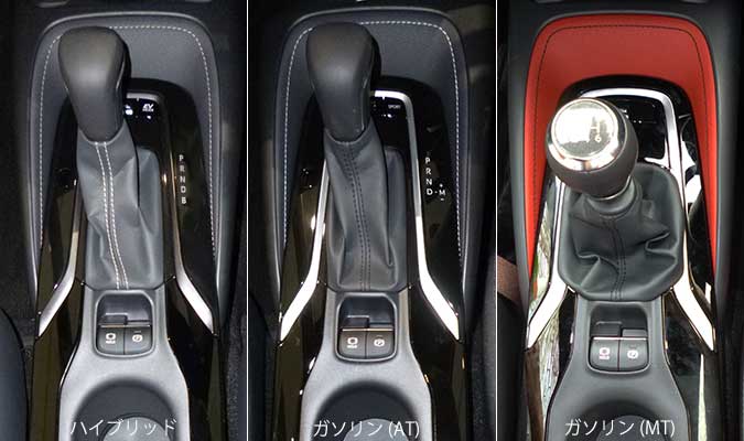 ハイブリッドとガソリンではパターンと共にレバー前方の走行モードスイッチも異なる。