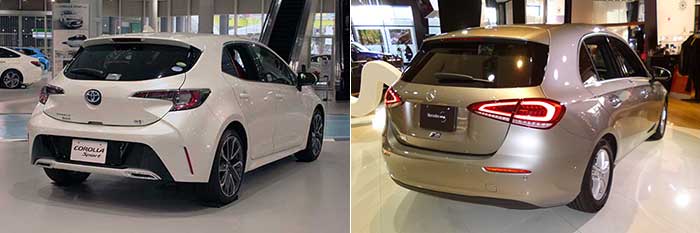 全長 x 全高はカローラ スポーツが 4,375 x 1,790㎜ 、A クラスが 4,420 x 1,800㎜ でホイールベースは其々 2,640 および 2,730㎜ 。全長はカローラスポーツが 45㎜ 短く、ホイールベースも 90㎜ 短い。Aクラスは特にホイールベースが長いが、別に長ければ良いってえ問題じゃない。寧ろ短い方が運動性が良いのはポルシェ 911だって 997 から 991 で 100㎜ 長くなっただけで独特のレスポンスが劣化したと嘆いたマニアも多かったくらいだ。