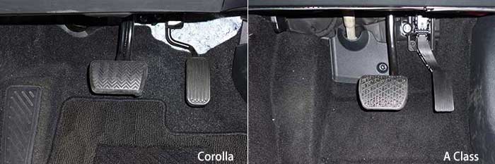 ペダルについても、これまた大した違いは無い。大体おベンツ様とは言えAクラスは FWD 、日本で言うところの FF だから、その点ではカローラと同じ。アクセルペダルだってどちらも吊り下げ式だ。それどころかAクラスでは左側のフートレストに滑り止めすら無い。