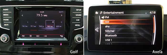 両車ともオーディオ操作はディスプレイを使用する。しかしディスプレイが付いているからナビが標準かといえばそうではなくオプションだった。ただし、アクセラはオプションのナビがメモリーカードで供給され、それを差し込むだけなのでオプションの取り付けは一瞬で終わるし、価格自体も安い。