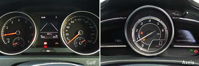 メーターは其々のメーカーの主張がある部分なので当然ながら各社各様だが、今回の2車もゴルフは左右対称の円形メーターがそれぞれ回転計と速度計で、それらの丸いフレーム内に小さいメーターが組み込まれている。これに対してアクセラはセンターに大径メーターが一つでその左右には液晶式のパネルがあり、この液晶にはバリエーションによって表示されるものが異なる。右下の写真はMT車なので結構あっさりしているが、AT車ならば少なくともシフトインジケーターが加わる。また写真ではセンターがアナログ回転計とデジタル速度計だが、車種によっては中央がアナログ速度計で左の液晶がアナログ表示の回転計になったりと、同じ部品をソフトの違いだけで対応させるという最近流行りのコストダウンを行っている。