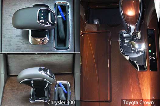 今回は実際に走行するにあたって最初に操作するATセレクターと運転中は常に目に入るメーターについて比較する。 ATセレクターは4車ともフロアーコンソールに配置されている。このコンソール上には多くの場合ATセレクター以外にもオーディオや走行モードなどを切り替えるスイッチやダイヤルが付いているが、今回の4車の内2車、すなわちクライスラー300とクラウンのコンソール上にはATセレクター以外には何も無かった。