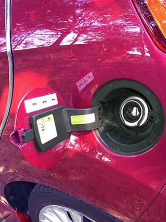 給油口はカバーを開けると普通は中にある給油キャップが無く、給油ノズルを差し込むとシールドがオープンする構造で、これは結構使い易そうだが何となく不安でもある。 ヘッドライトは極々普通のハロゲンバルブを使っている。またフォグランプは標準装備。