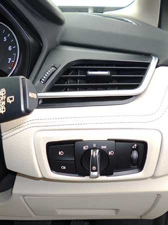 センタークラスターのナビやオーディオ、そしてエアコンも、フロアーコンソールのAT セレクターや iDrive のコマンドダイヤル、そしてパーキングブレーキのスイッチも含めて Active Tourer と同一となっているのが判るだろう。