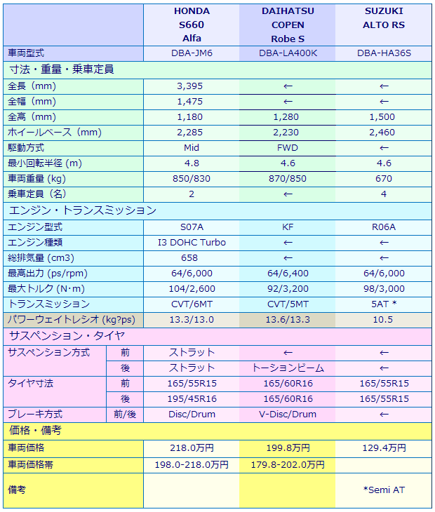 先日アップした S660 簡易試乗記の最後で軽スポーツ3車種 (S660、コペン、アルトRS) の比較試乗記を特別編として計画中ということに触れたが、実を言えばこのところ試乗記を溜め込んでしまい直ぐの間に合いそうもないことから、先ずはこの日記で写真比較を行うことである程度の方向性を見極めることにした。 先ずは今回比較する3車の諸元一覧表だが、何しろ軽自動車の場合は全長と全幅はほぼ同じであり、エンジンも排気量 0.66L で最高出力は64ps だから、スペック比較という面では何とも面白みの無い結果となる。 それでも全高とホイールベースは其々異なるから、この2つを比較するだけでも大いに意義がある。そこで最初にホイールベースを比較すると一番短いコペンの2,230o と一番長いアルトの2,460o では何と 230o もの差があるが、これはアルトが実用車をベースとしていることから室内の広さを確保するためにギリギリまでホイールベースを伸ばした結果だろう。そして、同じ2シータースポーツでもS660 がコペンより長いのはミッドシップエンジンという構成上の結果で、その意味では3車3様であり、これをユーザーからすれば解り易いから選択も容易‥‥かといえば、これがまた中々複雑だったりする。