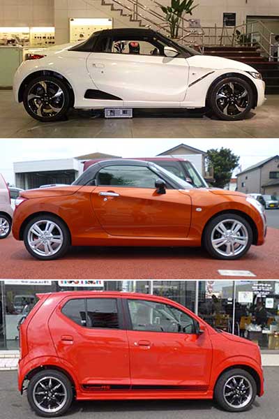 軽自動車だから全長は枠いっぱいの 3,395o だがホイルベースと全高の違いで、随分と雰囲気が違う。ホイール&タイヤは見た目ではS660 が最もスポーティーに見えるが、これはグレードによっても違うので何とも言えない。