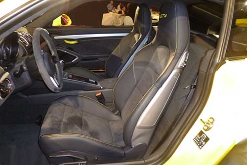シートや内装のレザー部分のトリムは GT3 と同様にイエローの糸を使っていて、またスカッフプレートには GT4 のロゴ が付いている。