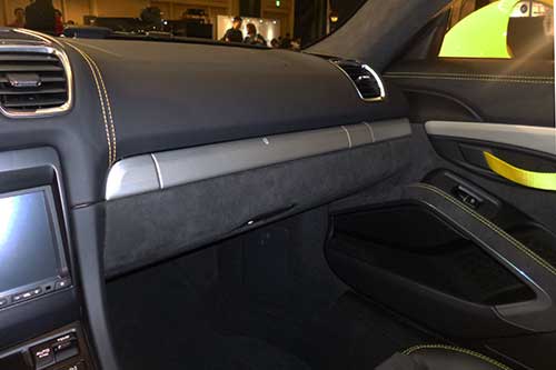 ブローブボックスの蓋もアルカンターラ貼りとなっている。またインパネ上部は黄色いステッチが見えるが、これは恐らくオプションのレザーパッケージが装着されていたのだろう。GT4の価格は一見すると911のベースグレードよりも安く感じるが、実際にこういうオプションを付けたらば、結構な値段になりそうだ。