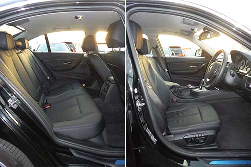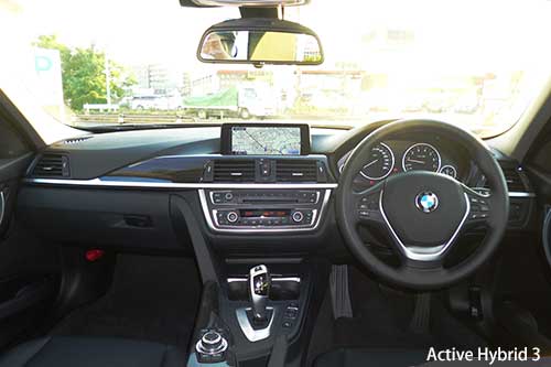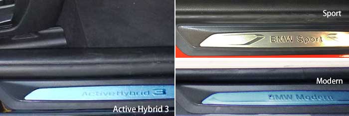 ドアを開けてインテリアを見ると、やはりハイブリッド独特のものは見当たらない。試乗車はオプションのレザーインテリアを装備していたから、3シリーズとしては高級過ぎる(?)くらいだが(写真7)、勿論320iだって同じデザインラインとオプションを選べば、写真と同様になる。 ここで床面に目を移すと、乗り口にあたるドア・シル・プレート(サイドスカットルプレート)には"Active Hybrid 3"のゴロがある。今まではこの場所にデザインライン、すなわち"BMW Sport"`や"BMW Modern"というロゴがあったのだが、ハイブリッドに限っては異なっているようで、やっとハイブリッド独特の部分を発見!といっても機能上は全く関係ない内容だが(写真8)。 |