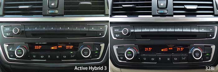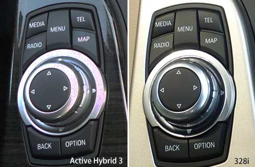 次にインパネに目を移すと、まあここまでの状況から想像は出来たが、やはりハイブリッド独特の部分は無くて、写真で比べてもどちらがハイブリッドか全く判別がつかないくらいだ(写真9)。そして、勿論センタークラスターにあるオーディオとエアコンの操作パネルも同じだし、更にはセンターコンソール上のiDriveのコマンドダイヤルとその周辺のスイッチ類までも同じだった。ただし、ディスプレイに移る画像は当然ながらハイブリッド独特の部分があるが、まあそれはソフトウェアでどうにでも対応できるから、要するに別部品にすると金のかかるハードウェアについては完全に共通化して、内部のメモリーに記憶される制御コードのみを変えることで対応している訳だ。これは、世界一ハイブリッド車の生産台数が多いであろうトヨタでさえも、ハイブリッド専用車種ではないクラウンやレクサスIS,GSなどでは、ハイブリッド独特の操作機構などは無く、如何にもハイブリッド車という操作はプリウス等のハイブリッド専用車に限られている。 |