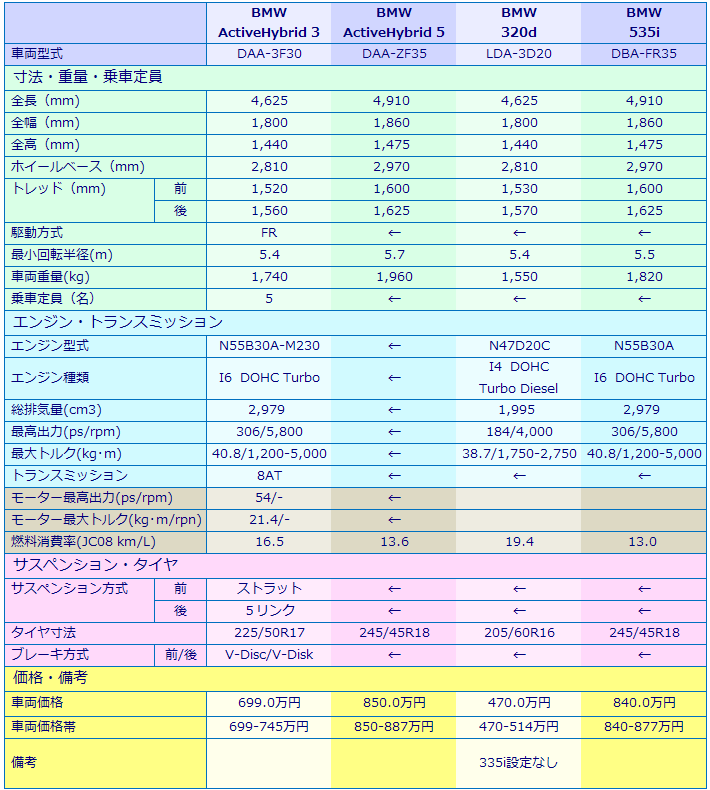 プリウスが世界初の量産ハイブリッド車(HV)として発売されたのは1997年12月だから、既に15年以上も経過したことになるが、当時HVは電気自動車(EV)へ移行するまでの暫定的な方式と思われていた。しかし、 EV用のバッテリーの開発は思うように進まず、結局15年以上経ったいまではむしろHVが主流になった感さえある。そして、BMWでさえもHVをラインナップするなどとは、正直言って15年前には想像すらしていなかった。 BMWのハイブリッド車の日本国内販売は3シリーズのActive Hybrid 3が昨年の7月に、5シリーズのActive Hybrid 5はそれより少し早い3月だった。ということは、Active Hybrid3の発売から既に1年が経過していてチョッと白け気味だが、今回やっと取り上げる気になったので紹介しよう。というのは、新しいレクサスISもハイブリッドのIS300hが全体の7割というから、この手のプレミアムクラスでのハイブリッドというのも捨てたもんじゃあない、ということで、それではBMWのハイブリッドってどんなもんなの?ということもあった。なお、ISと時期を同じくしてアコードも新型となり、国内ではハイブリッドモデルのみを販売するが、アコードの場合は正直いってISとはクラスが違うのは言うまでもなく、アコードのライバルはアウターサイズ的に近いクラウンでもなく、やはりカムリということになる。 実はBMWのHVとしては7シリーズベースのActive Hybrid 7が2010年に発売されているが、7シリーズというのは多くが法人登録であり個人ユーザーが自腹で買う例は少ないであろうとうことで、特に取り上げてはいなかった。そこで今回は7シリーズに比べてより一般的な3および5シリーズHV車(とはいえ、これも充分に高価だが)に試乗してみた。まずは3、5シリーズのHVと代表的なガソリンおよびディーゼル車の諸元比較から始めることにする。