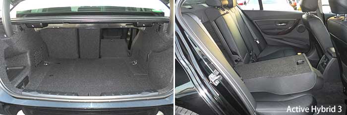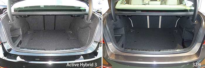 それではエクステリアで明らかにハイブリッドモデルと判別できる部分はといえば、Cピラー側面とリアトランクリッド後端にある"Active Hybrid 3"のエンブレムとなる(写真3)。トランクリッドにエンブレムを付けるというのは多くのクルマが実施しているから当然として、Cピラーにデッカいエンブレムを堂々と貼り付ける(写真4)のはあまり美しいとはいえないが、まあこれは各自の趣味に任せよう。 ハイブリッドといえば、パワートレインと共に気になるのがリアのラッゲージスペースであり、一般的に大型のバッテリーをリアシートバックレストとトランクスペースの間に置くことから、トランクスペースは極端に奥行きがない場合が多く、リアシートを倒してトランクスルーなんていうのは夢のまた夢、なんていう状況だが、Active Hybrid3に関してはなんと、ガソリン(とディーゼル)エンジンモデルとほとんど変わらないスペースがある(写真5)し、トランクスルーすら可能だ(写真6)。 |