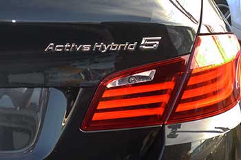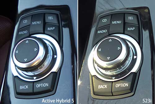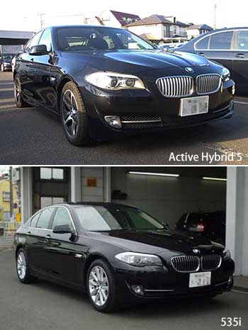 前編ではActive Hybrid 3とガソリン&ディーゼル(非ハイブリッド)版3シリーズの内外装を比較したが、今回は5シリーズベースのActive Hybrid 5についても同様な比較を行ってみることにする。 比較相手は主として535iとするが、前編でも触れたようにActive Hybrid 5と535iは直6 3Lターボエンジンは全く同じもので、これに電気モーターによるシステムを追加したのがActive Hybrid 5であり、前編の結果も踏まえれば比較前から両車の共通点の多さが想像できる。 エクステリアから比べてみると、3シリーズと同様にActive Hybrid 5がガソリンもしくはディーゼルの5シリーズとひと目で分かるような違いは見当たらなかった。特に比較したのが全く同じエンジンを搭載している535i だったこともあり、リアのマフラーも同じく左右出しとなっているから、増々区別がつきにくい。 |