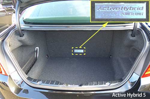 前編の最後でも触れたように、ActiveHybrid 5はガソリン車、特に同じエンジンを搭載する535iとは内外装ともほぼ同様だったが、ActiveHybrid 3とは違いトランクのスペースにバッテリーの搭載スペースが食い込んでいるために他の5シリーズよりも奥行きが短いという違いがあった。 |