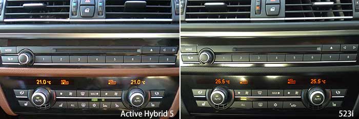 インパネについても、535iと比べて違いは判別できない。比較写真の535iは内装色の違いやシートのオプションなどがActiveHybrid 5と異なるために、比べた場合は多少印象が異なるが、これが同じ内装色ならば限りなく似ているであろう(写真29)。 そして、当然ながらiDriveのコマンドダイヤルと周辺のスイッチ類も全く同じだ(写真30)。いや、それどころか、前編で紹介した3シリーズとも同じだった。 更にはセンタークラスター上のオーディオおよびエアコンの操作パネルも全く共通となっているのも3シリーズと同様だ(写真31)。ただし、iDriveのダイヤルのように3シリーズと共通かといえば、ここは流石にユニット自体が異なるようで、これらは1と3および5と7でそれぞれ共通になっている。 |
