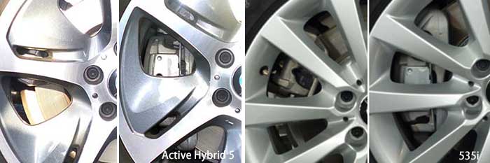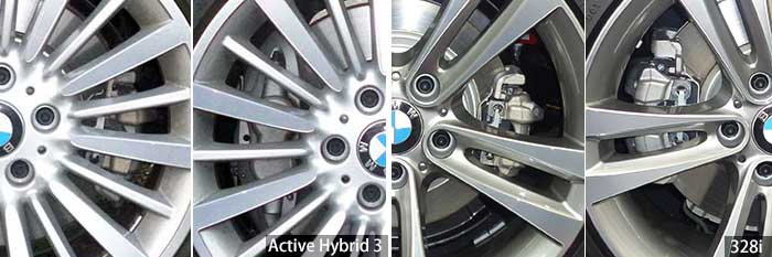 実は車両重量の違いのもたらす恩恵は、加速性能以上に操舵性で発揮された。ActiveHybrid 5のもさーっとした操舵特性に比べて、軽量なActiveHybrid 3は走り初めた瞬間から軽快感を感じるほどで、ステアリングレスポンスも充分にBMWサルーンの標準的レベルであり、5で感じた操舵性の悪さは一気に解決、というところだ。ただし、そうはいっても320iの1,500sに比べれば240sも重いわけで、3シリーズ本来の軽快さには及ばない。実際にちょっとしたワインディング路を走ってみても、まあ決して悪くはないのだが、3シリーズというにはチョイと物足りない。例えば最近FMCされたDセグメントという3シリーズと同じ車両クラスであり、しかもハイブリッド車のレクサスIS 300hに比べると、ISの方が素直なハンドリングというかニュートラルな旋回特性というか、何とActiveHybrid 3を上回っているのではないか、というくらいにレクサスが進歩したのか、BMWのハイブリッド車がイマイチなのか、ということだ。ただしActiveHybrid 3の動力性能はIS 300hとは異次元なくらいに強力だから、まあ比較するのが間違いではあるが‥‥。 ブレーキについては何時ものように軽い踏力で良く効くが、従来のBMWよりは喰い付きが穏やかだったとはいえ、フィーリング上で特に大きく変るようなことは無かった。ところが、試乗を終わって念の為にフロントホイールのスポークの隙間から見えるブレーキを見ると、何と対向ピストンらしきキャリーパーが見えるではないか!(写真43) BMWといえばM5でさえ先代までは片押しキャリパーを使うなど、ブレーキに金を掛けないことで有名だったが、ActiveHybrid 3は対向4ピストンキャリパーを奢っていた。そういえば、先代の135iクーペも対向ピストンだったが、これらは今後BMWが方針を変えて、上級モデルには対向ピストンを使用することにするの布石なのだろうか。