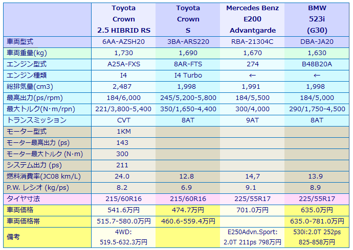 今回の試乗比較の車種は へえーっ、クラウン 2.0L って530i 相当なんだぁ!? と言う事になるが、本当かよ?というのが本音だ。しかしクラウン 2.0 ターボに試乗していないのは知らない方が幸せという事と、実際にこれを試乗車としているディーラーが殆ど無い事が原因だが、今迄の経験からすればあまり期待は出来ない。因みに同エンジンを搭載した車種の試乗記としては と言う事で、それでもクラウンだけがハイブリッドというのも多少引っ掛かる点もあるだろうが、まあトヨタはハイブリッドに関しては最も進んでいる、すなわち強みだから許してもらおう。