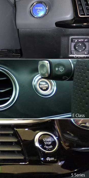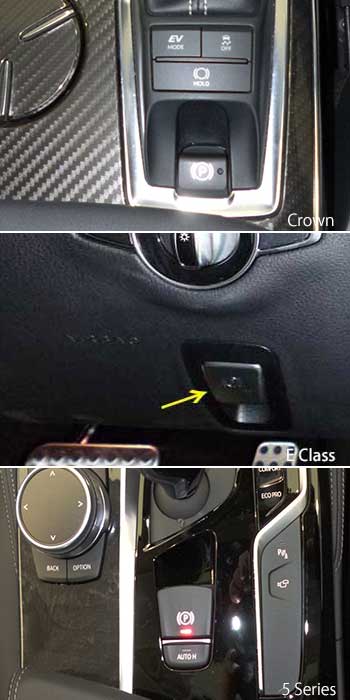 Toyota Crown 2.5 Hybrid RS 試乗記 特別編 走り出す為に先ずはイグニッションスイッチを押してエンジンを始動する‥‥と書きたい処だが、今回の比較でクラウンはハイブリッドの為に厳密に言えばパワースイッチをオンすると言うべきだ。そして他の2車はガソリンエンジンではあるが、最近のクルマには当然のアイドリングストップ機能を備えていて、しかも始動直後のデフォルト状態ではキャンセルとならない為に、そのままでは原則としてエンジンは止まっている事になる。あっ、勿論コールドスタートではエンジンが適温になっていないから恐らくアイドリングストップは作動しないとは思うが。そのスイッチはクラウンではステアリングの右側、他の2車では左側 (センタークラスター右側)に配置されている。 パーキングブレーキは何れも電動式で、その場所はクラウンと5シリーズがコンソール上の AT セレクター手前に、そしてEクラスはダッシュボード右下面に配置されたスイッチを使用する。ここで判り辛いのは、コンソール上では引いてオンであり、ダッシュボードでは押してオンになる事で、これは前車がレバー式後者が足踏み式をダッシュボードのレバーを引いてオフする事に起因しているが、判り辛い事には否定できない。