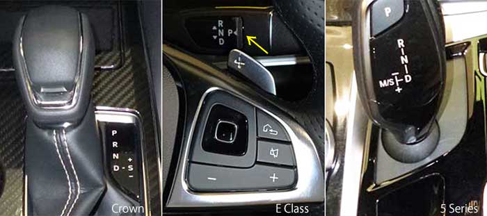 次に AT セレクターをDレンジに入れるが、その方式は3車で全く異なり、クラウンはコンソール上の直線式のメカニカル方式で、E クラスはステアリングコラムから生えたレバー方式、そして5シリーズはコンソールだが電子式のレバーを使用する。まあ進化の度合いではクラウンが一番遅れている、何て言ってはいけませんぞ! オーソドックスでコンベンショナルな技術を継承しているのは流石に保守本流のクラウンらしい、と言うべきだ。おまえ、トヨタから金もらってるんか? と言われそうだがそんな事がある訳も無い。(くれればもらうけど)