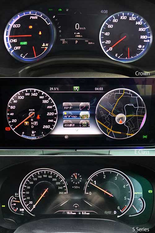 前置きが長くなってしまったが、それでは早速3車の走りを比較して見る。先ずはクラウンの発進時だが、僅かにアクセルを開くとクルマは音も無く前進するのは流石にクラウンと言いたいが、ハイブリッドだから当たり前だ。そのままユックリと移動するといつの間にかエンジンも掛っているようで、その繋がりも極自然だ。公道に出てからハーフスロットルで加速してみると、ハイブリッド独特のトルク感は確かに感じるが穏やかだ。50q/h 以下で流れに乗って走っていると電気モーターのアシストも適度で、これぞクラウンという気楽な走りが出来る。 次に E200 だが、僅かなクリープと共に軽くアクセルを踏むとゆっくりと前進し、狭い裏道をゆっくりと移動するような極低速でも実にスムースに希望する速度を維持できる。表の道路に出てハーフスロットルくらいで加速すると、スペックから想像する以上のトルクで加速し、その時のエンジンのスムースさはこれが本当に4気筒なのかと疑いたくなる程に滑らかだ。う〜ん、お見事!パチパチパチ。 E200 のスムースなエンジンには驚いたが、スムースな事では定評のある BMW の 523i はハーフスロットル位で加速すると、これまたその滑らかな加速に驚く。と言う事で3車共に実用速度では充分にスムースであり、クラウンは当然ながらハイブリッドだから発進時に最大トルクを発生するモータ―の300N-m の恩恵を受けているから静かでスムースでトクルも充分だが、他の2車も電気モーターなどが無くても結構クラウンのハイブリッドに対抗しているのは立派なモノだ。 ただし、そのスムースな523i であるが、以前の自然吸気 (NA) 6気筒 2.5L の極めて素直なレスポンスや加速感に比べると、やっぱり何かが違うような気がするが、まあ4気筒でそのフィーリングを結構再現したのは大したものだ。そしてE200 だが、以前はスムースさと言う面では BMW に一歩を譲っていたメルセデスのエンジンだが、最近は全く遜色無いところまで進化しているのも、これまたご立派! ここで3車のメーターを比較してみる。3車共文字等の表示はカラー液晶表示となっているが、メーター本体についてはクラウンはメカ式、他の2車はこの部分も液晶だが、Eクラスは全面が1枚の液晶パネルで金物は一切無いのに比べて、5シリーズはメーター外周のリングはハードウェア、すなわち実際にリングが存在している。何やら話が判り難いが、今や昔ながらの自光式メーター何ていうのは見られなくなった。なお、クラウンは一見すると一番遅れているようにも見えるが、実は世界に先駆けて全面液晶パネルを採用したのはクラインの初代ハイブリッドだったが、時期が早過ぎたのかその後は止めてしまった。まあ当時のCG技術ではリアリティの無い画像になってしまうのは仕方ない事だったのだろう。 Eクラスの全面液晶パネルの場合は、メーターの配置もサイズも自由だから、モードによってメーター径が変わったりもするなどメリットは大きいし、数を作れば価格もメカ式よりも安くなりそうだから、将来はこれが当たり前になるだろう。 ところでカラー液晶パネルというと、また韓国の安モノに独占されるのか? 何て心配になるだろうが、クルマの部品と言うのは冬の氷点下から夏の 40℃以上までの厳しい温度条件と常に掛る振動などで、家庭用のテレビのようには行かない。従ってこの自動車用カラー液晶パネルは今のところ日本の専門メーカーが独占している状態だ。