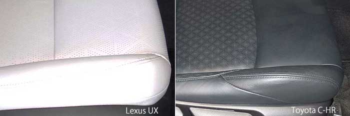 次に室内を比べる事にする。先ずは何時ものようにドアを開けて目の前のインテリアを見れば‥‥まあ今回の2車はシートカラーがマルで違うので一見して雰囲気が異なるのだが、それはそれとしても写真では良く判らないが、現物はやはり質感が異なっている (写真21)。特にシートは大きく異なり、写真の UX がバージョンLである事から本革シートが奢られているのが大きな原因だが、実は C-HR も上級モデルのGである為に本皮/ファブリックのコンビ、すなわちサイドは本革なのだ (写真22) 。しかしその質感は大いに異なり、UX のよくなめした柔らかそうな質感に対して、C-HR はゴワゴワ硬そうでツルツル滑りそうで、これならファブリックの方が良いんじゃねぇ、何て事になる。しかも UX ではセンターの表皮には細かい通気穴が模様を描いているという凝りようだ。トヨタブランド車の本革は、同じ会社なのにレクサスブランドと大いに異なり、10年物のクラウンアスリートの本革仕様何てアチコチひび割れが出て、見るも無残な状況になっているのを見た事がある。 シートのポジション調整は UX の場合は当然ならがフルパワーで、その調整はシートベースの側面にシートの形をしたスイッチという高級車では極々当たり前の方式を採用している。これに比べると C-HR は上級モデルとはいえ手動式で、電動はオプションにすら無いのはヒエラルキーをシッカリと維持しているのだろう。加えてスカッフプレートなる何の役にも立たないがブランド好きの心を擽るモノも、UX では高級メッキに ”LEXUS” の文字が浮き出している立派なモノが付いているが、C-HR にはプレート自体が存在しない (写真23) 。 |
