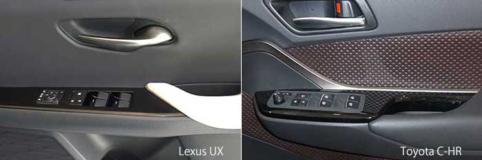 ではドアのインナートリムは如何だろうか? 既に日記の写真紹介で述べたように、UX のトリムは決して褒められたモノでは無く全体的にプラスチッキーに感じるが、それより下位の C-HR は当然それ以下であろうと推定したが、UX と比べるとそれ程の差は感じられなかった (写真24) 。まあそれでもドアノブは UX の半艶クロームに対して C-HR では普通の光沢クロームだし、UX のアームレストはレザーパッドにステッチ入り (写真25) だが、C-HR は弾性樹脂の一体成型という差が付いている。とは言え、何しろ面積の多くを占める一体成型の部分が似たような質感というのが痛い。 いやそれどころか、C-HR ではアームレスト周辺の結構広い範囲にファブリックを使用しているから、見方によっては寧ろ UX に勝っているとさえ感じるくらいだ。 |