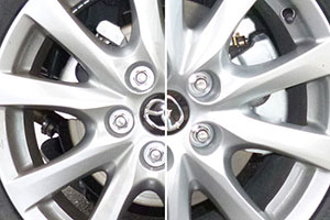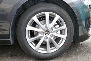 ディーゼルのXDがアテンザの中では最もハイギアードとなっているのは、使用する回転域が低回転側でトルクが大きいから当然であり、また一番の高回転タイプで逆にトルクが低い20Sがローギアードの設定になっているのも常識どおりだ。320dの場合はアテンザの6速に対して8速という多段ミッションを装備しているために、当然ながらきめ細かい制御ができるが、トルクバンドが広くフラットなディーゼルの場合、あえて8速が必要かという疑問もあり、一概にアテンザが6速だから駄目、ということもない。ただし、320dは100q/h巡航を8速1,600rpmという低い回転数で達成出来るのに対して、アテンザXDでは6速 1,800rpmと幾分高くなる。 ディーゼルエンジンについてはBMWを上回るという予想外の結果だったが、それでは操舵性はどうだろうか。結論を先に言えば、国産FF車としては充分に満足できるが、BMWと比べるとちょっと分が悪い。なにより、ステアリング系の剛性感がイマイチで路面からのインフォメーションも殆どない。今回は結構長めの試乗時間がとれたので、ワインディングが続くコースを走ってみた。ただし、ローリング族が出没したことから道幅はポールで狭められて、しかもコーナーにはゼブラの舗装が施されているので、完全に安全圏内の速度でしか走れないが、それでもアテンザは国産FF車としては弱いアンダーステアで素直に曲がっていく。しかしステアリングの応答はイマイチだし、ステアリングギア比も緩慢な設定なのか、思ったよりも舵角を切り増しする状況が頻発していた。この原因はアンダーステアというよりも、ステアリングギア比の問題のような気がしたので、添付の諸元表をみたが残念ながら記載はなかった。恐らくロックtoロック回転数が大きいのではないか。 ブレーキについてはリアがパーキングドラムを持たずにキャリパーにパーキング機構を組み込んだP付きといわれるタイプになっているが、これは先代からの伝統となっている。そして効きは市街地での試乗では特に問題は無かった。まあ、最近の国産車でブレーキの効きが悪くて問題だ、なんていうクルマは殆ど見かけなくなったから、これは当然だろう。なお、アテンザは全グレードでアルミホイールが標準装備されている。