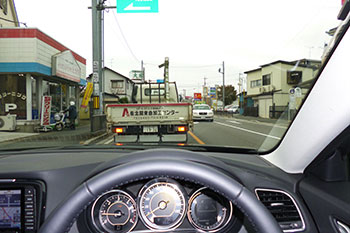 見かけどおりに欧州車的な硬めの座り心地のシートに座り、上級のL Packageだとフルパワーでのシート調整ができるが、試乗車はベースグレードのために手動式でポジションを合わせる。次にステアリングコラムの底面あたりを探ってみるとレバーらしきものがあったのでこれを引いてみたらばステアリングが上下に動 最初に片側2車線の国道を60km/h位で巡航している時のエンジン回転数は約1,500rpmで、エンジンの振動も殆ど感じないし音も充分に静かだから、パッセンジャーは特に説明がなければこのクルマがディーゼルだということに気が付かないだろう。前車との関係で一度速度が20q/hくらいまで落ちても少しスロットルを踏むだけでスムースに加速するし、この程度の加速ならばエンジン音も気にならない。今度は同じく20q/hから2/3スロットルで加速すると約4,000rpm位までスムースに回転が上昇してシフトアップされた。