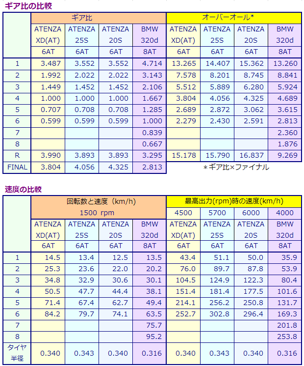 今回のアテンザはフルスカイアクティブということで、ATもロックアップを多用した6速AT(SKYACTIV-DRIVE)が搭載されている。そしてそのご利益はといえば、確かにトルコンのスリップは少なめでダイレクト感はあるが、欧州車まで含めてATとしては特別驚くほど凄いかといえば、それ程でもないように感じる。ただし、これはディーゼルエンジン自体の出来があまりにも良すぎるために相対的にミッションの評価が下がってしまうということもある。そしてシフトショックについては殆ど気づかないくらいにスムースではあるが、マニュアルシフト時のレスポンスなどを見る限りでは、レスポンスよりもスムースな繋がりを重視しているようにも感じる。 XDにはマニュアルモードは勿論のこと、ステアリングホールにはパドルスイッチまで備わっていたので早速Mに入れて見る。うまい具合に ところで、マニュアルでレッドゾーンまで引っ張った時のシフトレスポンスは充分なものだったが、もしかするとレッドゾーンのリミッタでシフトアップ指令が既に出ていたのかもしれない。というのは、その後のマニュアルシフトはイマイチのレスポンスだったからだ。といっても、トルコンATとしては標準的なものだが、スカイアクティブミッション(SKYACTIV-DRIVE)とはいえ、マニュアルシフト時のレスポンスまでは手が回らなかったのか、元々ATのマニュアルモードなんてオマケと思ってるのかのどちらかだろう。実際にこれだけフラットトルクだと、マニュアルシフトのメリットはほどんどないのはワインディング路で実感しているから、気にすることもないのだが。 アテンザにはマツダ得意のi-STOPというアイドリングストップ機構が組み込まれていて、信号 ここで動力性能について少し机上検討をしてみることにする。アテンザにはディーゼルのXDとガソリンが25Sと20Sのモデルがあり、これに”ライバル!”のBMW 320dを加えてのギア比を比較してみる。