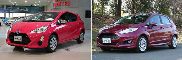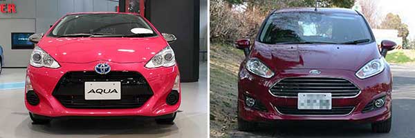 アクアとフィエスタのアウターサイズはほぼ同じであり、その割には車両重量はフィエスタが100kgほど重く、1.5L + ハイブリッドと1.0L ターボという差だってフィエスタが重い理由にはならないから、これはボティそのものが重いわけで、それだけフィエスタのボティがガッチリと高剛性構造なのか、トヨタの軽量化技術が優っているのかだが、まあどちらも有りそうだ。おっと、そうでなくて我が日本の技術の賜だと言う事にしよう。 トランスミッションについてはアクアは無段変速なので表では CVT と記しているが、これは国産の安物でお馴染みのスチールベルトのタイプではなく、モーターとガソリンエンジンのトルクを上手く結合する目的も兼ね備えた高度なものだ。対するフィエスタは欧州の主流となりつつあるデュアルクラッチ (DCT) タイプであり、これは本来もっと上級クラスで主流になっているものだ。 えっ、フィットだってDCT じゃねえか、って? 確かにそうだが、実は欧州の3流メーカー製を使ったためにリコールでひどい目にあった訳で、この話は1014年11月30日の日記で特別編としてまとめてあるので興味のある読者は 日記特別編 ホンダ車のリコール を参照願いたい。 それでは両車のエクステリアから比較する。 |