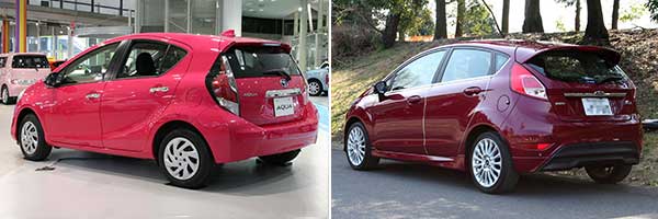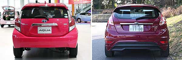 フロントのラジエターグリルを比較するとアクアは最近のトヨタのアイデンティティであるスピンドルグリル‥‥ではないが、よく見るとそれを逆にしたような変形の6角形であり、フィエスタはなんとアストンマーチン風のデザインだ。確かに少し前まではアストンマーチンはフォードの傘下だったがその後の財政難で手放しているから、別れた女房の嫁入り道具で生活してるみたいだで微妙なところだ。 リアの比較ではフロント以上にフィエスタのボディが丸いのが判る。ところでリアにハッチを持つ両車は、この形状からくる特徴であるテールランプの面積の小ささを感じるが、まあ実用なれば言い訳だから文句は言わないが‥‥。