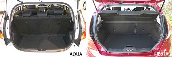 Bピラーから後方のルーフラインは両車ともリアエンドに向かって下降させているが、アクアの方がより強い角度であり、元々20o 低い事に加え写真左上のようにリアから見るとかなり低く見えるから、スポーティーで格好良いと見えるわけで、これで素人さんを騙しているわけだ。まあ、それでも後期モデルは走りの方も並みのクルマ程度には改善されたから未だ良いものの、前期型を買ったユーザーはチョイと悲劇だが、それを知らずに乗っていれは喜劇となる。 実は上記の部分はアクア vs フィットからの流用だが、やはりこれに尽きる。 次にリアゲートを開けて比べてみれば、そのスペースは似たようなものであり、全長が同じくらいの FWD ハッチバック同士だからまあ当然だし、サスもトーションビームだから室内への張り出しも無く、そういう意味では走りよりも実用を狙っているわけだが、このクラスならそれも当然だ。