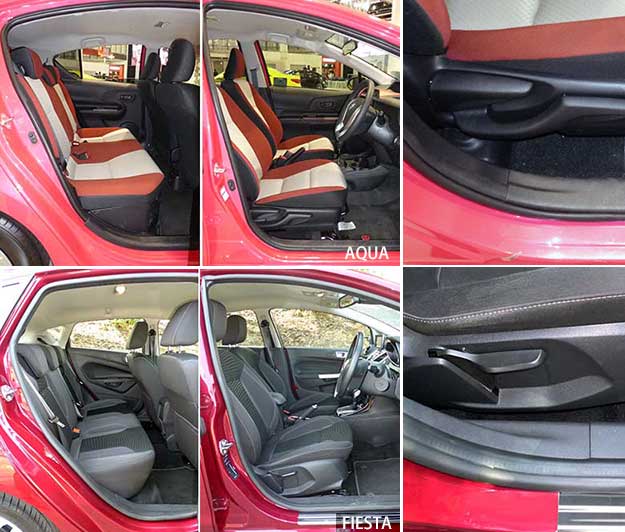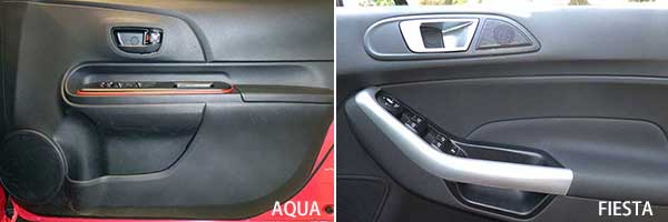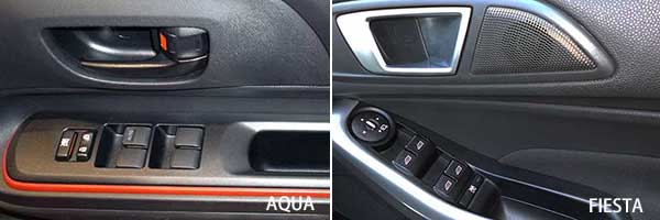 これも常々述べている事だが、ドアのインナートリムというのはインパネに比べて走行中にドライバーやパッセンジャーの目にとまる機会が少ないために、この部分の質を落としてコストダウンするのが一般的であり、その意味ではBセグメントであるアクアもフィエスタもよく見れば安っぽい樹脂成形を使用している。それでも両車ともそれぞれに工夫を凝らして何とか安っぽさを目立たないようにしようという努力の跡は認められる。すなわちアクアはスイッチパネルの周りに赤いラインを配してアクセントを付けたり、フィエスタは部分的にロームメッキパーツを使ったり等だ。