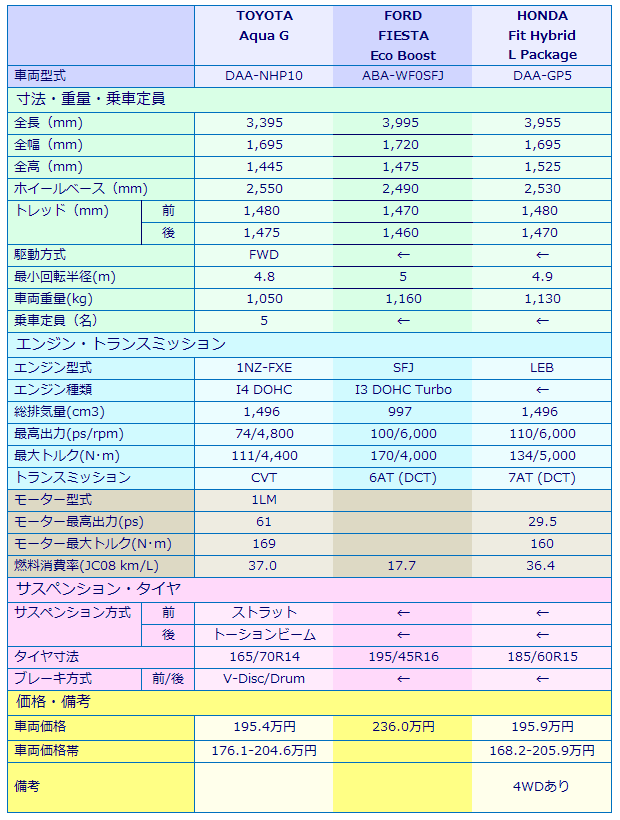 TOYOTA AQUA 簡易試乗記 特別編 [TOYOTA AQUA vs FORD FIESTA 前編] 特別編へようこそ。何時ものように、このコーナーは、この先の記事を冷静に読める知識と教養を身につけている読者のみ閲覧ください。従って、この先に何が書かれていようが、笑って受け流す事が出来ない方はTOPページに戻るかブラウザを閉じてください。 アクアのライバルといって最初に思い立つのはホンダ フィット ハイブリッドであり、価格的にも HV であることも、そして車両のカテゴリーもBセグメントと同じだからこれはもうドンピシャの対戦相手であり、実際にこの対決はHONDA FIT 13G & HYBRID 簡易試乗記 特別編 HONDA FIT HYBRID vs TOYOTA AQUA しかし今回、後期型のアクアに試乗したことで、前期型よりも大幅に改善されていることが確認できたから、アクアのリベンジのためにも再度フィット ハイブリッドとのリターンマッチというのも考えたが、改良されたとはいえアクアの走行性はやっと普通のクルアになった程度で、同クラスではダントツとも思えるフィット ハイブリッドと再戦したところで勝ち目は無さそうだ。ということで今度は対戦相手を変えて、先日の簡易試乗記でこれまた抜群の評価となったフォード フィエスタとの対決を考えてみた。まあフィエスタの走行性ならば本来はフィットが相手だろうし、フィットに敵わないアクアがフィエスタに勝てるのかという意見もあるだろうか、フィエスタは輸入車ということから割高な価格だし、ハイブリッドではなく小排気量ターボエンジンだから、経済性では流石にアクアに勝ち目があるわけで、総合的に比較する価値はありそうだ。 そして、実はもう一つの目論見は、フィエスタの試乗結果が良かったが、考えれみればフォードという鬼畜米英のメーカーであり、いまや憲法を勝手に解釈して戦争ができると突き進んでいる日本にとっては、自国の とまあ、くだらない事を書きなぐったが、ここで何時ものとおり各車の内容を確認するためにスペック一覧表をまとめてみた。