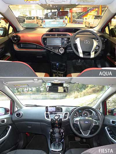ドアを開けて見える光景の第一印象はインテリアカラーによる部分が大きく、特にブラック内装とカラー内装を比較すれば、ブラックは当然ながら地味にみえるし、カラーならそれよりもお洒落に見える場合が多い (まあ例外もあるが) 。それを踏まえれば今回のアクアのシートはブリリアンレッドというものでアクアの中では最も派手な色だが、実はこれはSグレードにオプション設定されているものだ。 フィエスタの内装色はブラックのみのようで、まあグレード自体が一つしか無いわけで、販売台数を考えれば仕方ないだろう。まあ、実際に派手なカラーを取り揃えたとしても多くのユーザーは無難なブラック系を選ぶのが現実であり、BMW なども派手は内装のクルマは多くが展示車として発注したものだったりする。