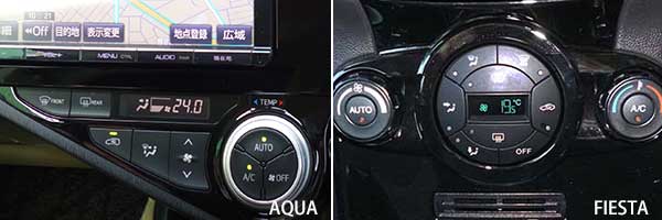 エアコンはどちらもフルオートタイプだが、当然ながらデザインやオペレーションは全く異なる。しかし、エアコンの操作はシンボルが統一されているからどんな配列でも特に説明書がなくても操作できるものだし、走行中に頻繁に使用することもないので慣れない操作で危険ということもない。