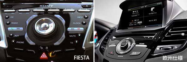 オーディオについてはアクアの場合はオーディオレスであり、インパネ中段にある2DIN サイズのブランクパネル部分にディーラーオプションまたは市販のオーディオを付けることになるし、ナビが欲しければオーディオ一体型を付ければいい。量販店などでは汎用の一体ナビは結構安く売っているから、結果的に買い得なのだが、操作性を考えるとオーディオやナビやエアコン等が集中制御できる専用品がライン装着されているタイプが理想だが、どうしても価格が高くなる傾向にある。そんな中で、最近のマツダは最初から統合システムが装着されているがナビはオプションで、しかも数万円のメモリーを追加するだけという実に合理的な方式となっている。 フィエスタについては日本向けにはSONY 製の専用オーディオが標準となっているがナビには対応していない。その為に試乗車では上部にコンパクトタイプのナビを付けていたが決して格好の良いものではないし、最上部にあるインフォメーションディスプレイが隠れてしまうなど不満も多く、これはあくまでも応急処置的だ。なお欧州ではどうなのかといえば写真右下のようにディスプレイを含めた統合制御ユニットが装備されているようだ。